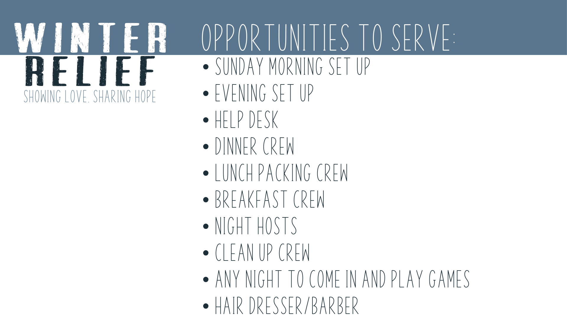 During this week each winter, we transform our gym into a dormitory and dining room for these men and women; serving and reflecting the love of Christ to them. Volunteers are needed for all aspects of the program – day and night hosts, meal preparers, bus riders, help desk personnel, barbers, hair stylists, laundry help, game coordinators, set-up/break-down crew, clean-up crew, lunch packers, and various other opportunities are available to serve our guests.